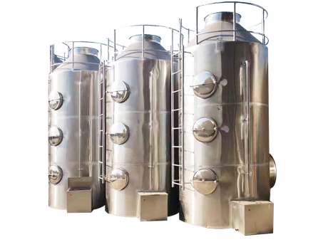 工作原理 廢氣經由填充式酸霧洗滌塔,采用氣液逆流吸收方式處理,即液體自塔頂向下以霧狀或小液滴噴灑而下;廢氣則由塔體逆流向達到氣液接觸的目的。此處理方式可冷卻廢氣、調理氣體及去除顆粒,再經除霧段處理后,可排放到大氣中。 產品特點